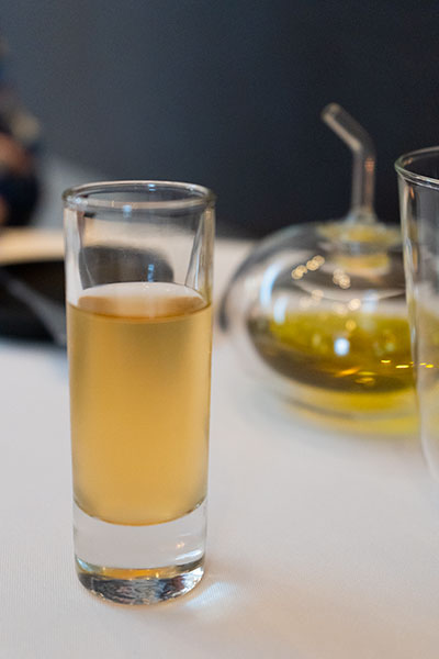 Om te dineren heb je keuze uit de à la carte of kan je een keuze maken uit enkele menu’s. Wij kiezen voor het 5-gangenmenu Menu ‘Point à la Ligne’. Starten doen we met een Crémant de Limoux van het Domaine le Moulin d’Alon (Résilience 2017), op basis van Chardonnay, Chenin en Pinot Noir. Als amuses volgen een thee op basis van vijg en abrikoos, een gazpacho op basis van rode pepers en tomaten, een maatje en een crème op basis van Gorgonzola, vijg en hazelnoot.